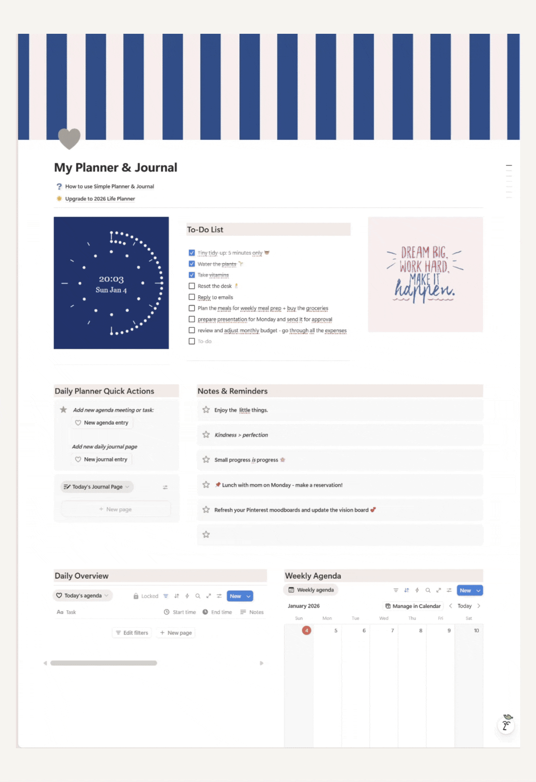 Get 2026 Life Planner here! 💗Cute & Simple Life Planner & Journal for Notion • Clean and easy-to-use dashboard • Daily, weekly & monthly planning views • Journaling pages with guided prompts and free writing space • Quick actions for adding tasks and journal entries • Notes & reminders section • Vision board for goals and inspiration • Fully customizable Notion template