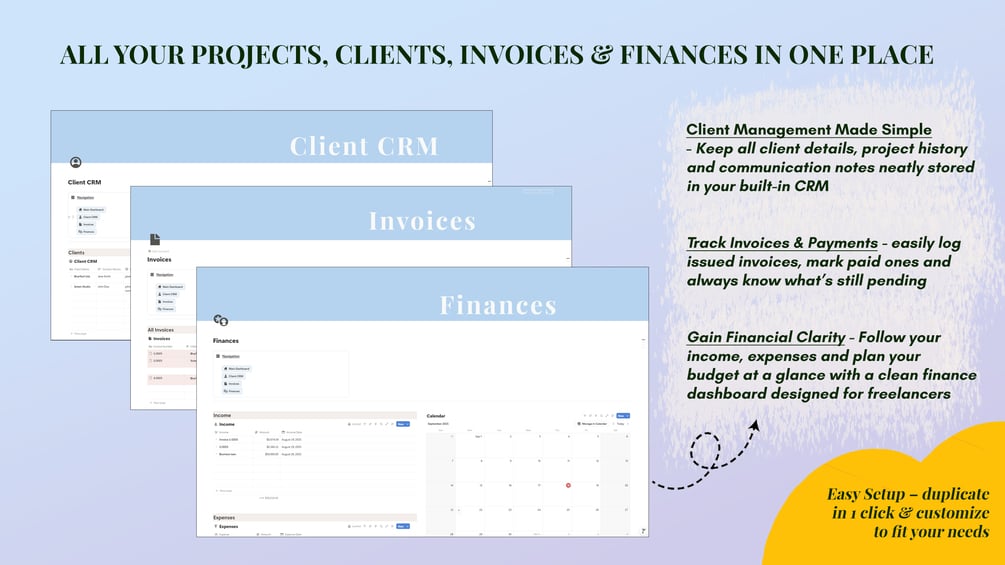 Organize your entire freelance business with one simple, ready-to-use Notion system - no more scattered tools, spreadsheets, or chaos.