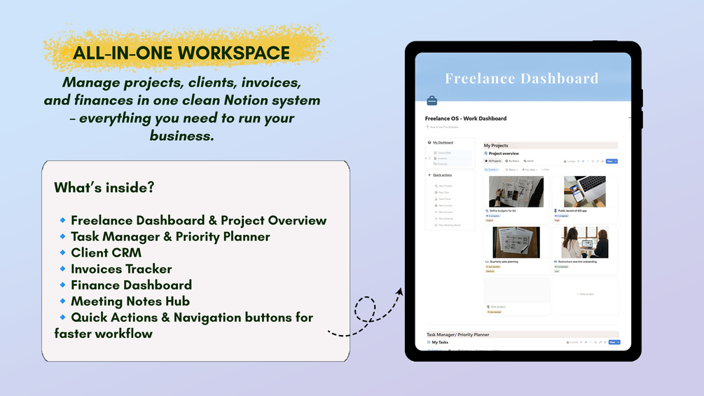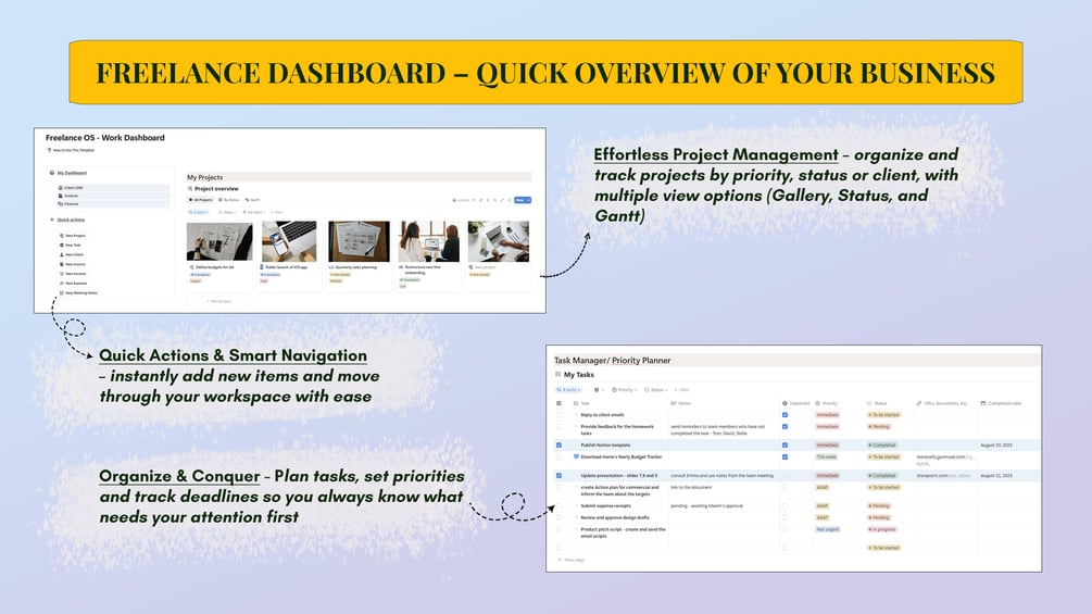 Organize your entire freelance business with one simple, ready-to-use Notion system - no more scattered tools, spreadsheets, or chaos.