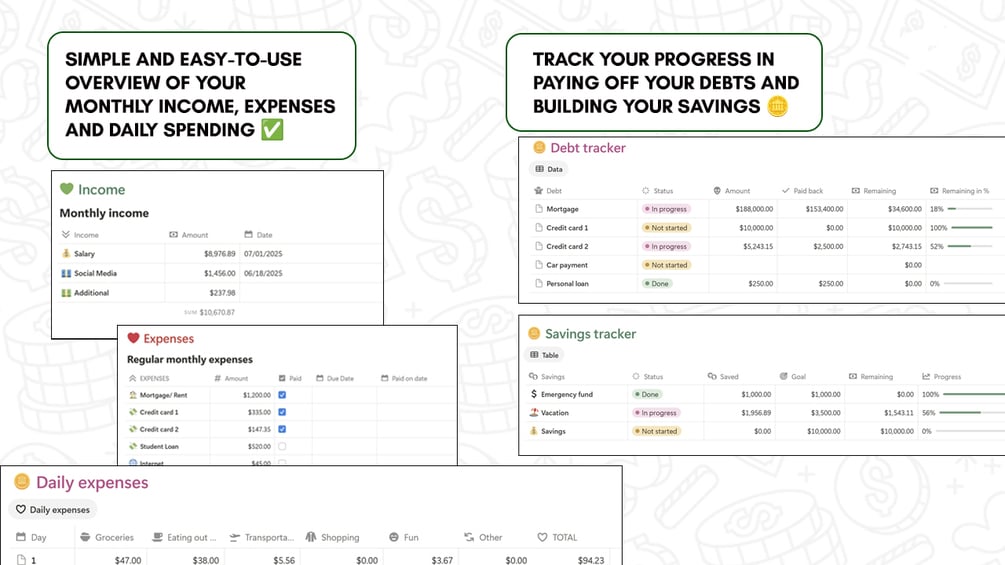 I originally built this template for myself when I decided to finally get serious about my finances - and it truly changed the way I manage money. It helped me bring clarity, structure and awareness to my income, spending, savings and goals.