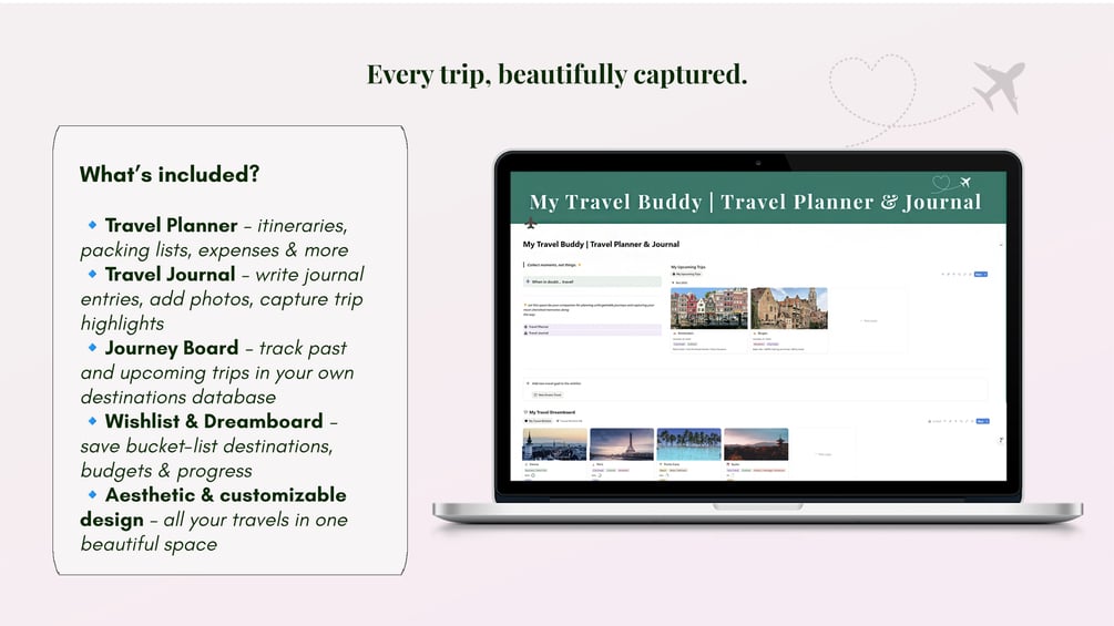Dream, plan, and remember every adventure – My Travel Buddy is your all-in-one digital travel planner & journal, ready to use in Notion.