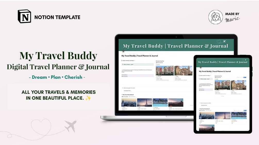 Dream, plan, and remember every adventure – My Travel Buddy is your all-in-one digital travel planner & journal, ready to use in Notion.