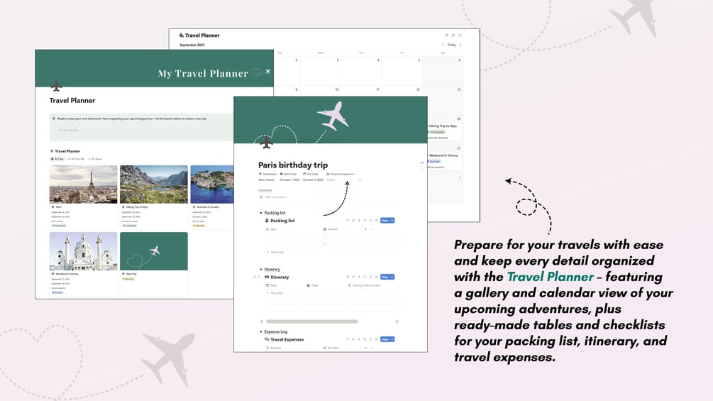 - Travel Planner – Create trip pages with ready-to-use templates for itineraries, packing lists, companions, budgets & more.