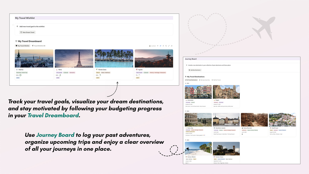 Yes, I want it! 💜My Travel Buddy is your digital companion for fun & effortless trip planning, travel journaling and dream mapping - all inside Notion.