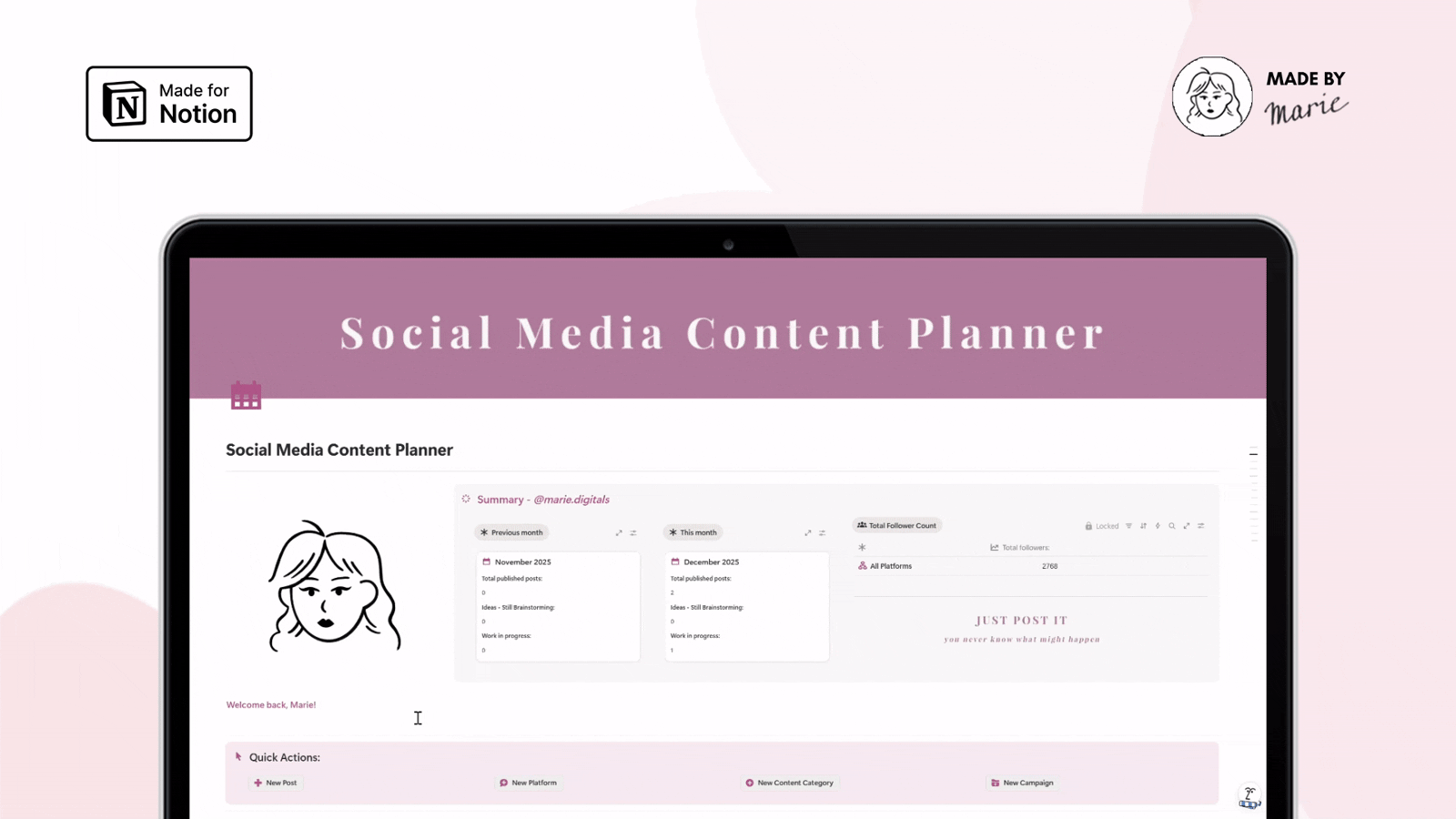 Instead of juggling notes, calendars and platforms, you’ll manage your entire social media workflow in one clean, aesthetic dashboard.