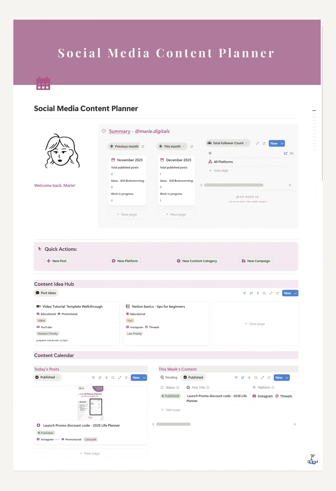 You’ll get: ▪️ A complete Social Media Content Planner built in Notion ▪️ Daily, weekly & monthly content planning views ▪️ Content Calendar with status-based color coding ▪️ Campaign tracking with goals, progress & days remaining ▪️ Platform-specific views for all your social media channels ▪️ Automatic post & follower statistics that update in real time ▪️ Content Idea Hub for brainstorming and quick captures ▪️ Fully customizable categories, platforms, views, icons & colors to fit your workflow